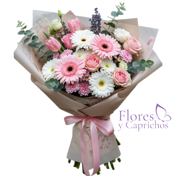 Lindo ramo con 10 yerberas, 5 tulipanes rosados, rosas bicolor y eucalipto, todo en fina envoltura de papel coreano mas lazo con cinta de tela.