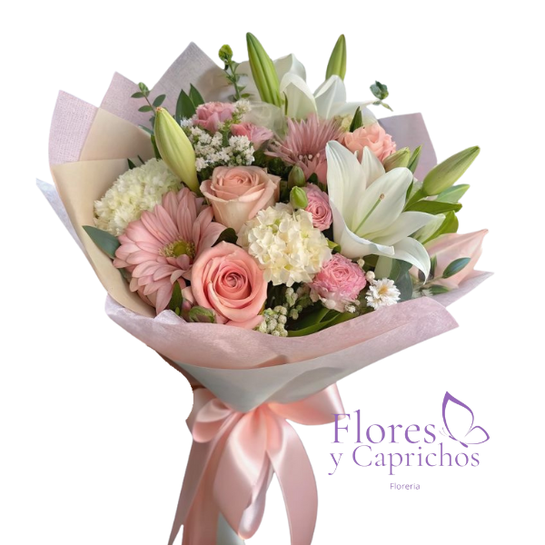 Lindo ramo con rosas rosadas, yerberas, lirios blancos y follaje de temporada, todo en fina envoltura de papel coreano y lazo con cinta de tela.