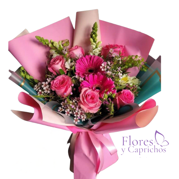 Lindo ramo con 6 rosas fucsias importadas y 2 yerberas en el centro mas follaje de temporada y perritos con fina envoltura de papel coreano mas lazo con cinta de tela.