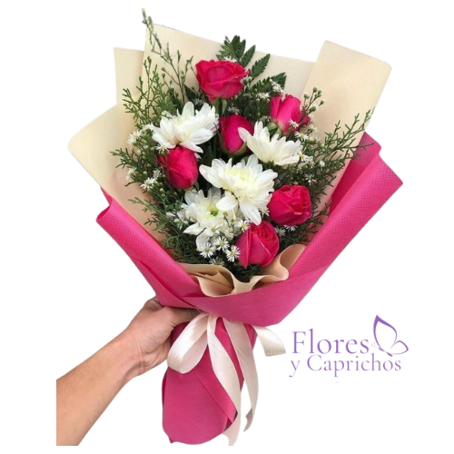 Lindo ramo con 6 rosas fucsias importadas , margaritas y verde de temporada en extendida envoltura de papel coreano mas lazo con cinta de tela.