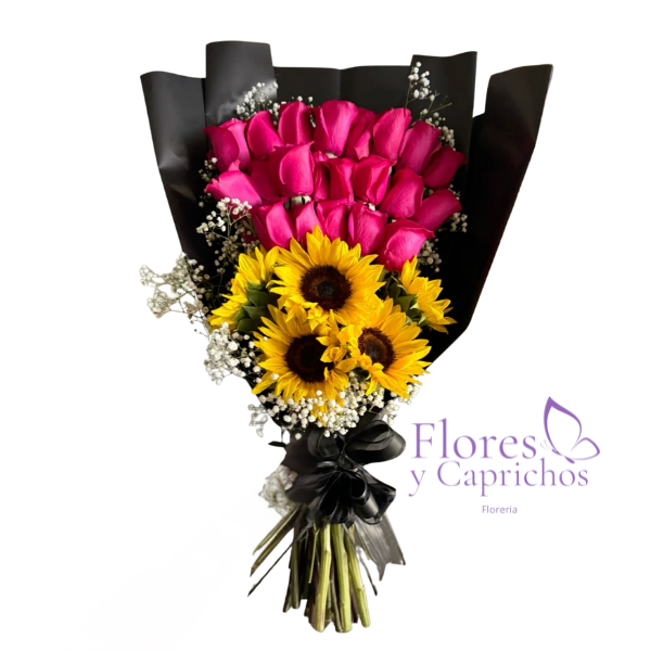 Exclusivo Ramo con 20 rosas fucsias Extendidas mas 5 lindos girasoles y gipsófila, todo en fina envoltura de papel coreano y lazo con cinta de tela.
