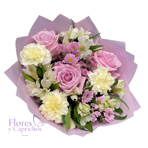 Lindo ramo surtido con 3 rosas lilas importadas, maule blanco, astromelia y verde de temporada , todo en fina envoltura de papel coreano mas lazo con cinta de tela.