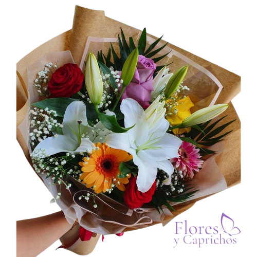 Lindo ramo con un mix de flores en fina envoltura de papel kraft y lazo.