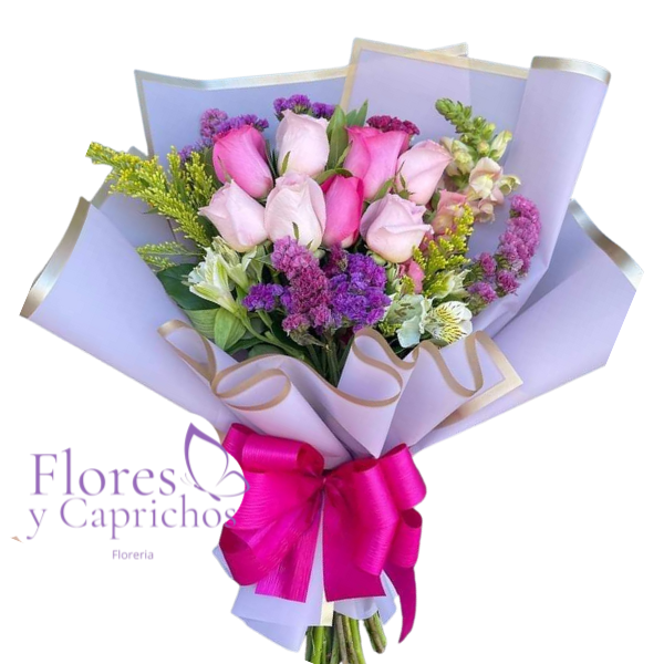 Lindo ramo primaveral que tiene 8 rosas bicolor importadas mas follaje de temporada, todo en linda envoltura de papel coreano mas lazo con cinta de tela.