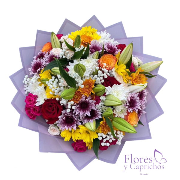 Lindo ramo con un mix de flores y lirios con fina envoltura de papel coreano mas lazo con cinta satinada.