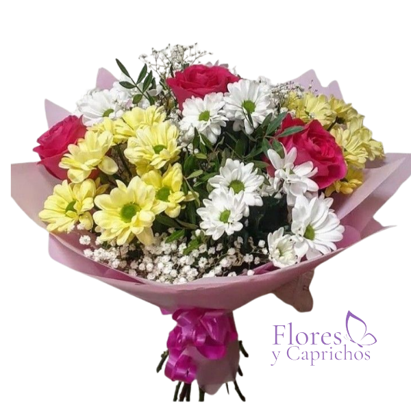 Lindo ramo surtido con margaritas , rosas y follaje de temporada en fina envoltura de papel coreano mas lazo con cinta de tela