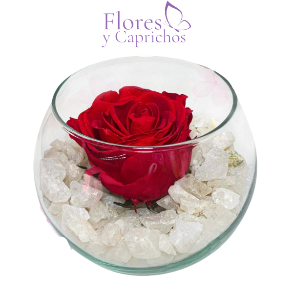 Linda pecera con rosa preservada roja y piedras de decoración.