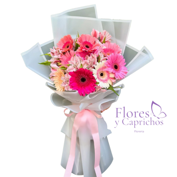 Lindo ramo con 10 yerberas rosadas y astromelia con fina envoltura de papel coreano y lazo con cinta satinada.